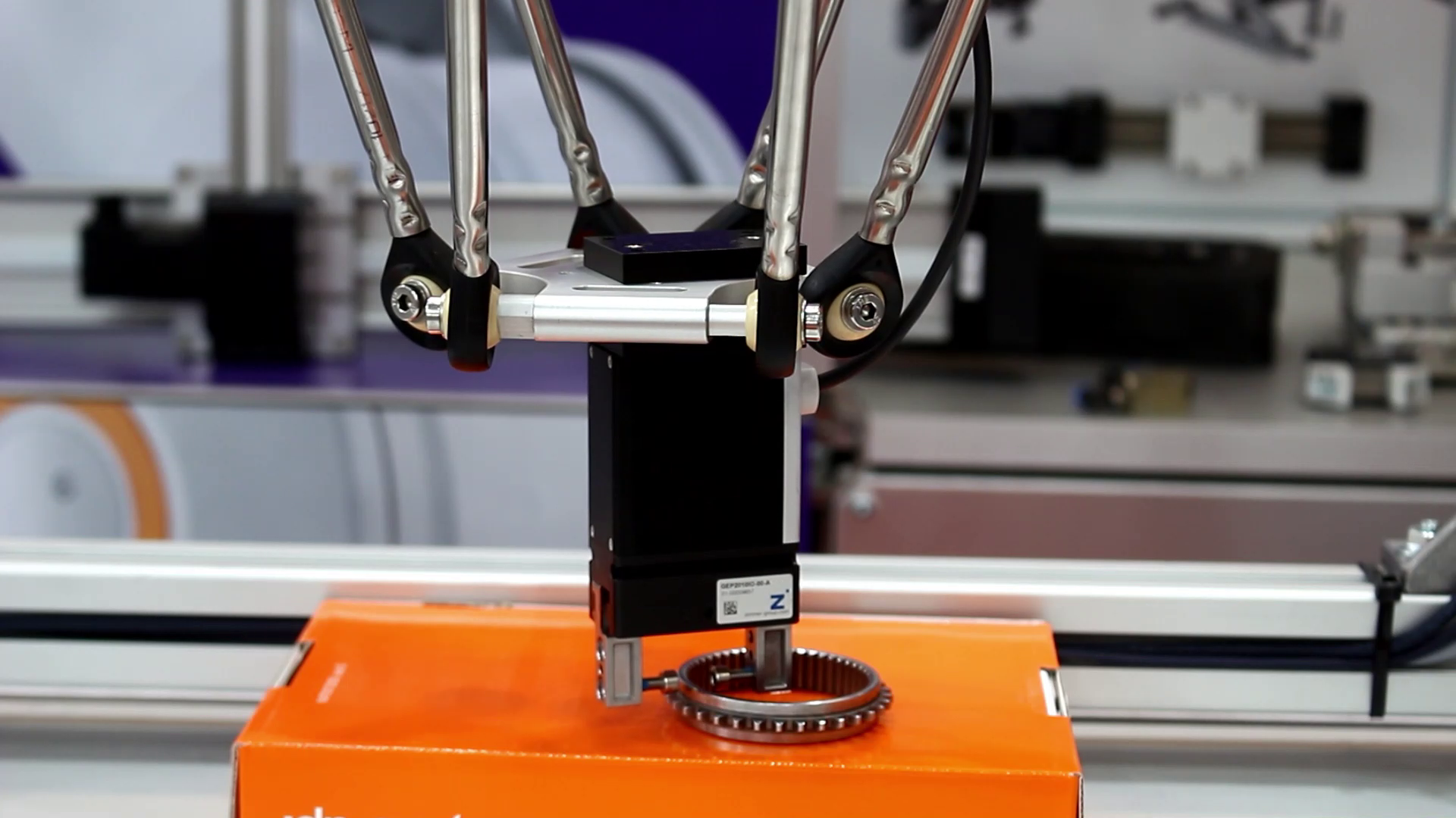 In deze toepassing voert een igus 3-assige Delta robot een nauwkeurige pick-and-place taak uit. De robot pakt de tandwielen op uit de eerste doos met de gemonteerde parallelle grijper van Zimmer en plaatst ze soepel op de tweede doos.